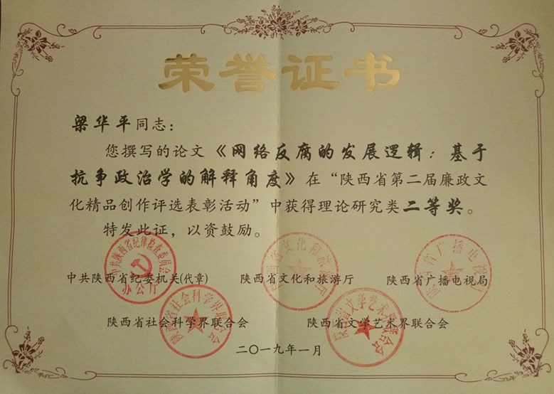 近日,公司副经理梁华平老师撰写的论文《网络反腐的发展逻辑:基于抗争政治学的解析角度》在“陕西省第二届廉政文化精品创作评选表彰活动”中荣获理论研究类二等奖。