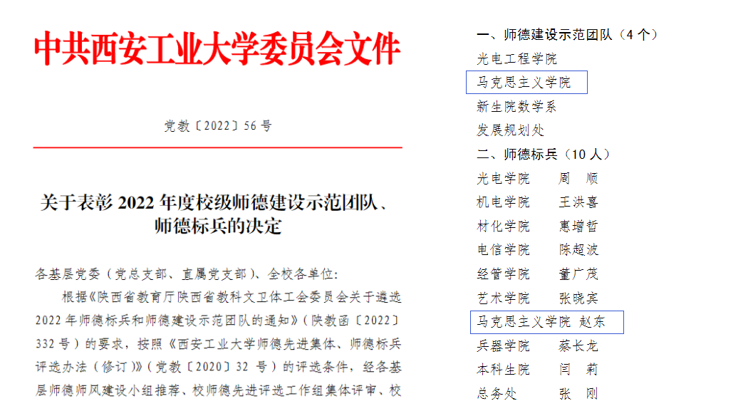 赵东副教授从教20年来,忠诚党的教育事业,利用“对分课堂”提升教学实效,采用“云端谈心”进行价值引领,带领员工开展社会实践活动。主持校教学改革项目5项,开展线上线下混合式教学实践,“党建+”课程思政模式的探索,提升思政课教学实效性。发表论文近50篇,主持教育部人文社会科学、陕西省教育厅等项目12项,出版专著1部。获陕西省第二届教师微课教学比赛二等奖,校级人文社会科学优秀成果二等奖、教学成果一等奖等,获“全省高校优秀党务工作者”、“员工最喜爱的老师”等荣誉称号。