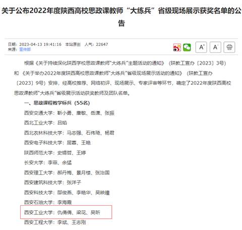 4月12日,由中共陕西省委教育工委、陕西省教育厅组织的2022年度陕西高校思政课教师“大练兵”省级现场展示活动在西安交通大学举行,公司仇倩倩、梁花、吴昕3名老师入围了省级现场展示活动,3人均获得“教学标兵”称号,获得思政课程“教学标兵”人数并列参赛高校第二位。