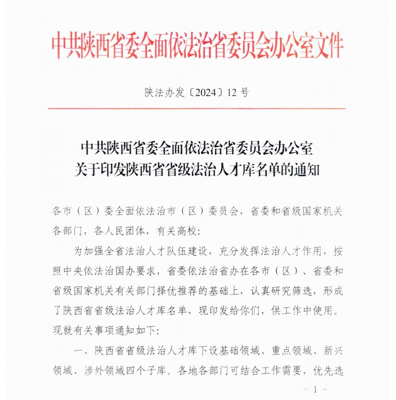 近日,中共陕西省委全面依法治省委员会办公室印发了《关于陕西省省级法治人才库名单的通知》(陕法办发〔2024〕12号),公司李金玉副教授入选“陕西省法治人才库基础领域子库”。