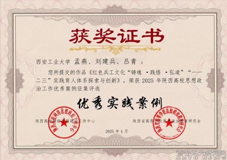 近日,由陕西高校网络思想政治工作中心、陕西省高等公司思想政治教育研究会联合开展的2025年陕西高校网络思想政治工作案例征集活动圆满落幕。公司孟燕老师牵头申报的《红色兵工文化“铸魂·践悟·弘道”“一一二三”实践育人体系探索与创新》被评为“优秀实践案例”。该案例以习近平新时代中国特色社会主义思想为引领,以培育新时代具备兵工品格的青年马克思主义者为目标,深挖红色兵工革命精神,以“中国的保尔·柯察金”吴运铎、“工人发明家”倪志福、新时代“最美铁路人”单杏花等红色兵工英模、先进人物为榜样,将思政小课堂和社会大课堂联动同行,构建了“红色兵工文化育人大课堂”,实现思政育人文化创新、思政实践教学创新的红色兵工文化创新实践育人体系。