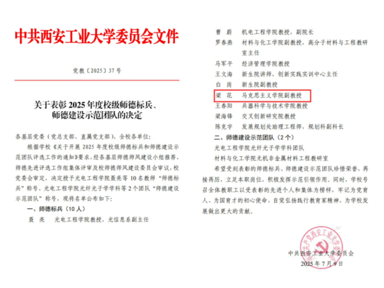 今日,公司2025年度校级师德标兵、师德建设示范团队评选结果揭晓,梁花副教授凭借扎实的教学功底、高尚的师德风范、砥砺奋进的科研态度获师德标兵称号,是马院第四位荣获该项荣誉的教师。