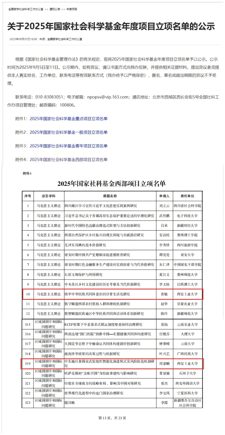 近日,全国哲学社会科学工作办公室发布《关于2025年国家社会科学基金年度项目立项名单的公示》,公司张敏教授、周意岷副教授喜获国家社会科学基金西部项目立项,并面向全社会公示。