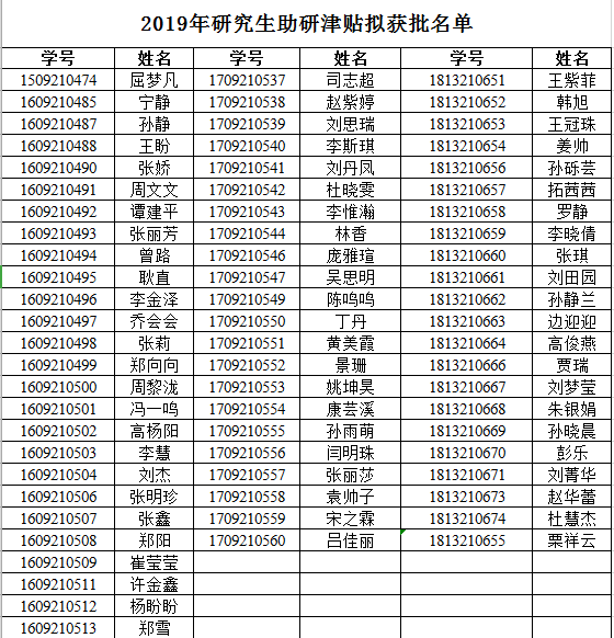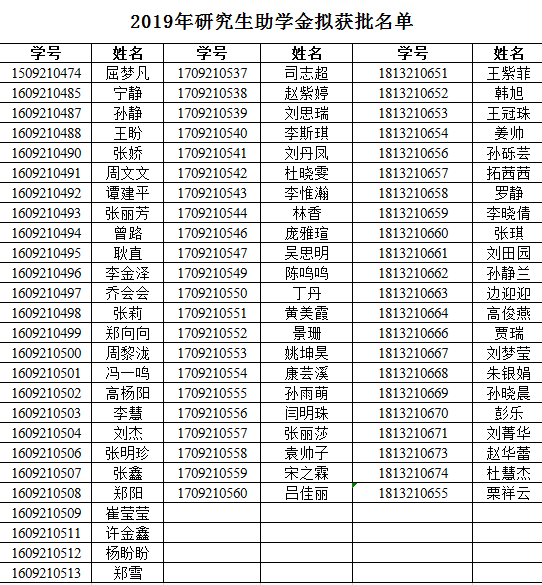 经william威廉英国官网研究生奖助工作评审委员会2019年4月19日评审决议,2015级屈梦凡、2016级宁静、2017级司志超、2018级王紫菲等70名同学符合研究生国家助学金、研究生助研津贴的申请条件,拟获批2019年4月研究生国家助学金、研究生助研津贴。现予以公示,公示时间为2019年4月19日至2019年4月23日,有异议的同学可向奖助工作评审委员会办公室(行政楼620)反映情况。