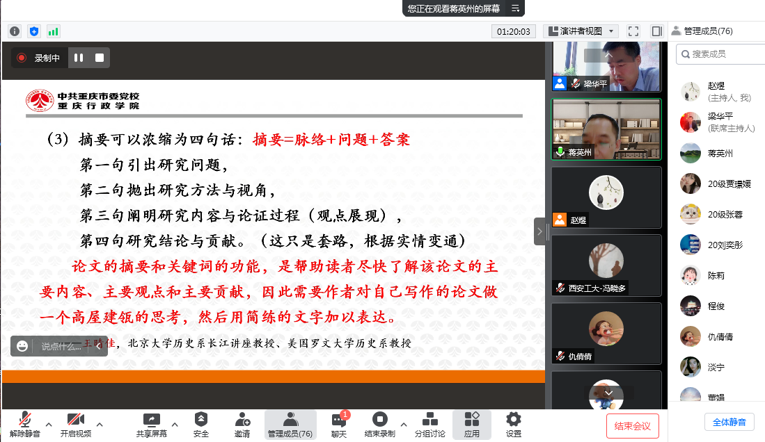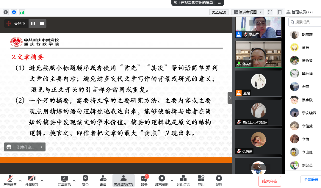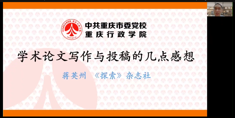 6月22日,william威廉英国官网邀请中共重庆市委党校《探索》杂志编辑部蒋英州教授在线上腾讯会议平台为公司全体师生做了题为“学术论文写作与投稿的几点感想”的学术讲座,此次为william威廉英国官网 “精彩学术观”系列学术讲座第十六讲。讲座由公司副经理梁华平主持,公司全体师生参加了此次学术活动。