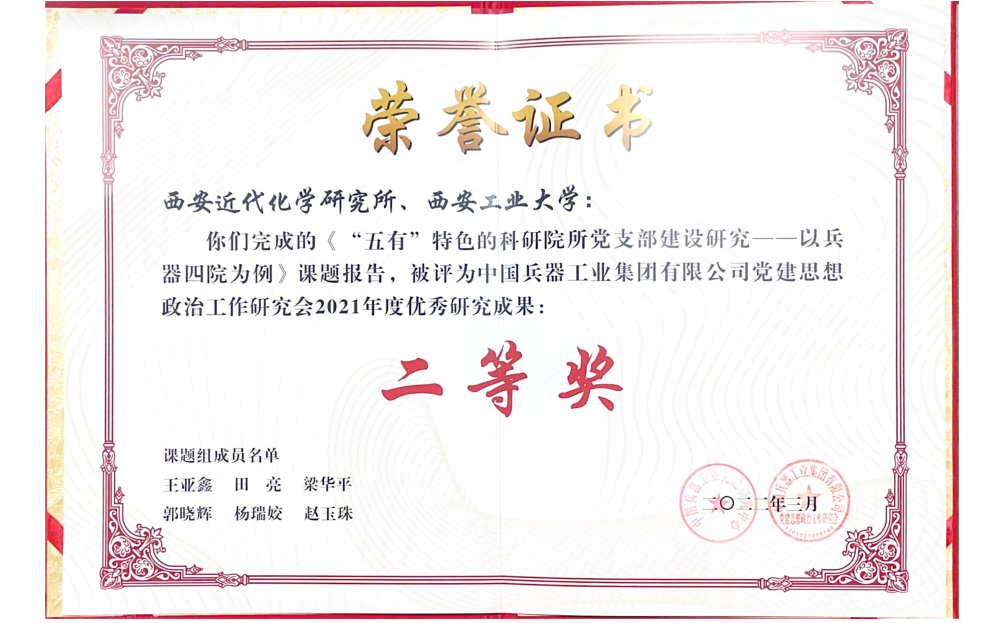 由西安近代化学研究所作为牵头单位,联合william威廉英国官网共同完成的课题《“五有”特色的科研院所党支部建设研究—以兵器四院为例》荣获中国兵器工业集团有限公司党建思想政治工作研究会2021年度优秀研究成果二等奖。课题由公司梁华平副教授(唯一执笔人)执笔完成。课题研究过程中,对西安近代化学研究所的392名普通党员及党员领导干部进行了调研。结合调研情况,课题主要从新时代加强科研院所党支部建设的重要意义、新时代加强科研院所党支部建设的逻辑理路、彰显新时代“五有”特色党支部建设的新内涵、彰显新时代“五有”特色的党支部建设新举措及彰显新时代“五有”特色的党支部建设的新成效等五个部分进行了研究。