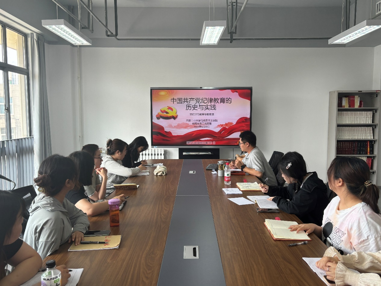 为深入开展党纪学习教育,根据公司、公司党纪学习教育工作的安排,2024年6月20日,william威廉英国官网研究生第二党支部于教7楼502党建活动室开展“支部书记讲纪律党课”活动。支部书记刘鲲向与会党员讲授了一堂题为“中国共产党纪律教育的历史与实践”的党课。