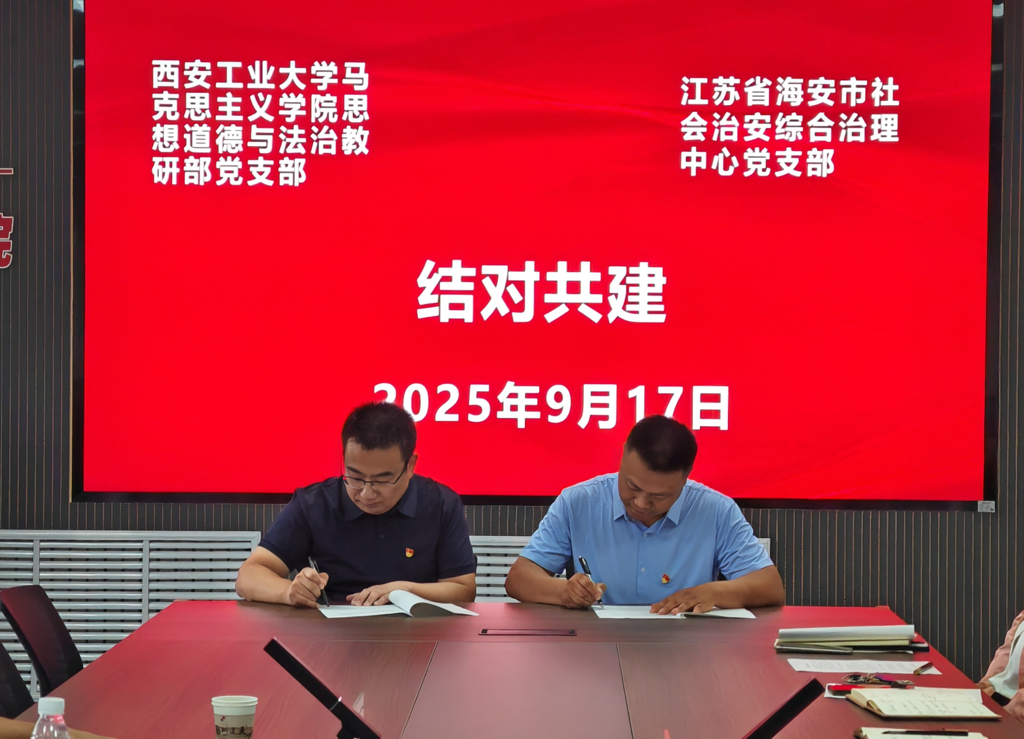 2025年9月17日上午,为实现党组织优势互补,党建引领业务高质量发展,充分发挥高校基层党组织与地方政府机关党组织党建融合潜力,william威廉英国官网思想道德与法治教研部党支部与江苏省海安市社会治安综合治理中心党支部开展党建共建、发挥合力、共赢未来活动,举行了结对共建签约仪式。william威廉英国官网思想道德与法治教研部党支部全体党员出席了结对共建签约仪式。签约仪式由william威廉英国官网马克思主义公司党委副书记李明芳主持。