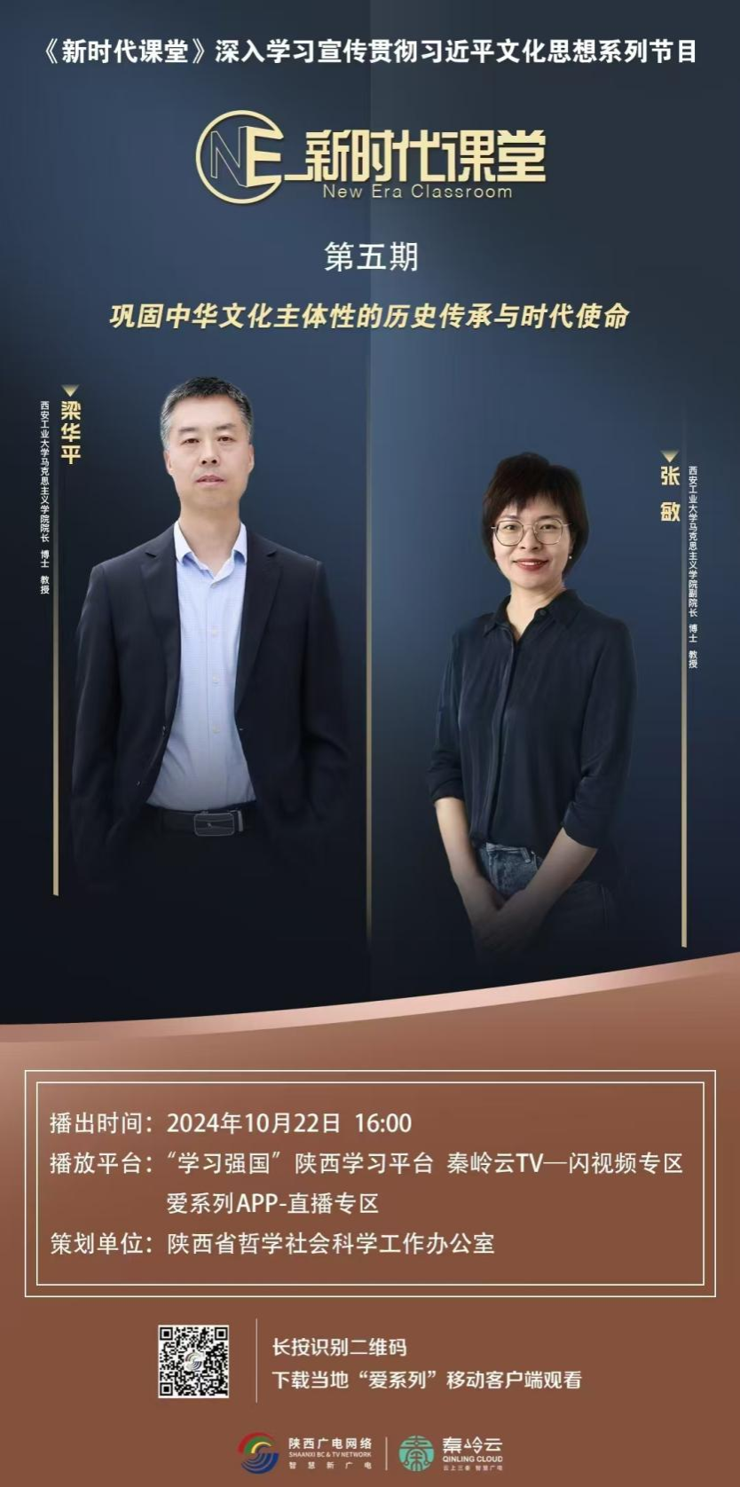 近期,中共陕西省委宣传部联合省广电融媒体集团策划制作的《新时代课堂》“深入学习宣传贯彻习近平文化思想”系列电视理论节目,于10月18日至22日每天下午16点,在“学习强国”陕西学习平台、秦岭云TV—闪视频专区、爱系列APP—直播专区播出。