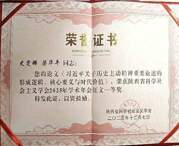 本次会议组织开展的学习贯彻党的二十届四中全会精神主题征文活动共收到论文60余篇,经专家评审,公司梁华平教授指导的硕士研究生史雯娜所撰论文《习近平关于历史主动精神重要论述的形成逻辑、核心要义与时代价值》荣获陕西省科学社会主义学会2025年学术年会征文一等奖。