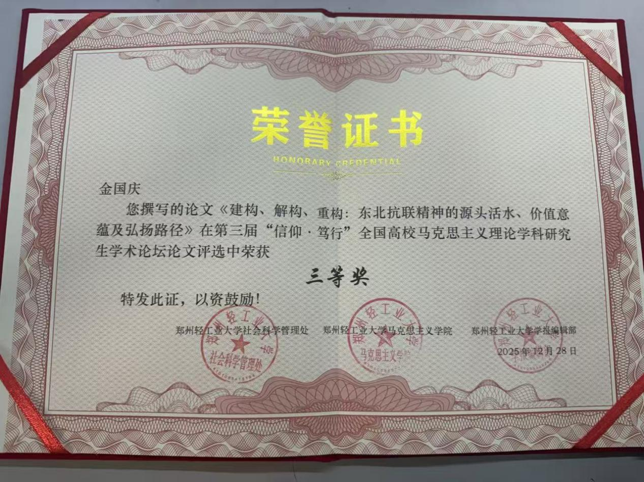 本次会议组织开展的征文活动共收到来自全国众多高校硕博理论文章1800余篇,经过学术不端检测和3轮严格筛选,评选出200篇优秀论文。公司刘俊丽教授指导的硕士研究生金国庆所撰论文《建构、解构、重构:东北抗联精神的源头活水、价值意蕴及弘扬路径》荣获学会2025年学术年会征文三等奖。