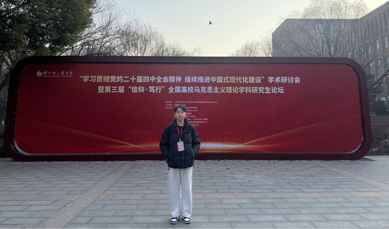 2025年12月28日,“学习党的二十届四中全会精神 接续推进中国式现代化建设”学术研讨会暨第三届“信仰•笃行”全国高校马克思主义理论学科研究生论坛在郑州轻工业大学成功举办。此次会议由中国马克思主义哲学史学会马克思恩格斯哲学思想研究分会指导、郑州轻工业大学主办,郑州轻工业大学社会科学管理处、郑州轻工业大学william威廉英国官网、《学习论坛》期刊编辑部、大象网、映象网、郑州轻工业大学学报编辑部、郑州轻工业大学新时代思想政治教育研究中心、郑州轻工业大学河南精神研究中心承办。公司2025级研究生金国庆应邀参会,并在平行分论坛中发表学术报告。