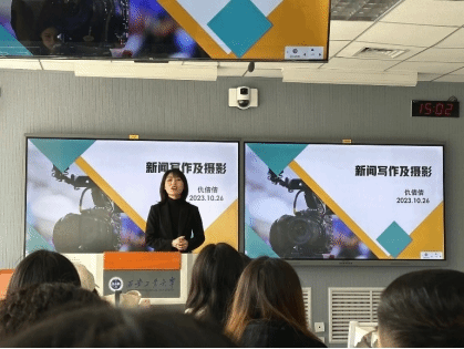 首先,仇倩倩引导师生就什么是新闻及新闻稿的写作规范问题展开讨论。接下来,仇老师介绍了新闻照片的拍摄技巧和方式。通过图片示例讲解了十三种构图方式。最后,仇老师指出摄影的主体需要鲜明、形象需要生动、信息需要完整、构图需要新颖、画面简洁。仇老师通俗易懂、深入浅出的讲解,进一步激发了大家对新闻稿的写作兴趣,现场气氛活跃。